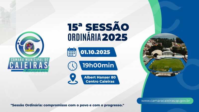 A Câmara de Caieiras realizou mais uma sessão ordinária (15a.) em 2025, no dia 01 de Outubro. A Tv Câmara transmitiu o evento ao vivo, via internet. Veja!